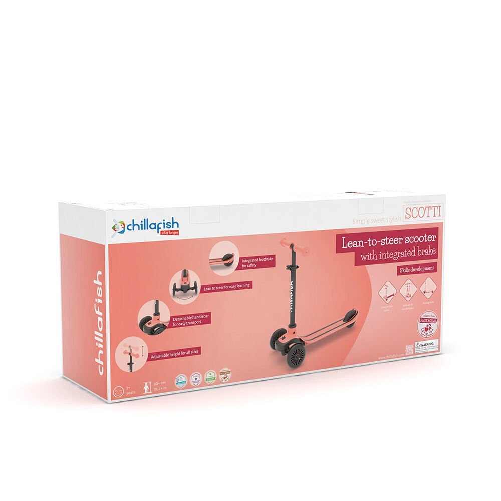 3 yaş ve üzeri çocuklar için tasarlanmış bu hafif (2,4 kg), 3 tekerlekli scooter sağa sola eğerek yönledirilir. Bu şık scooter Twintip ayak tablası ve entegre ayak freni ile Chillafish imzası taşıyor.
