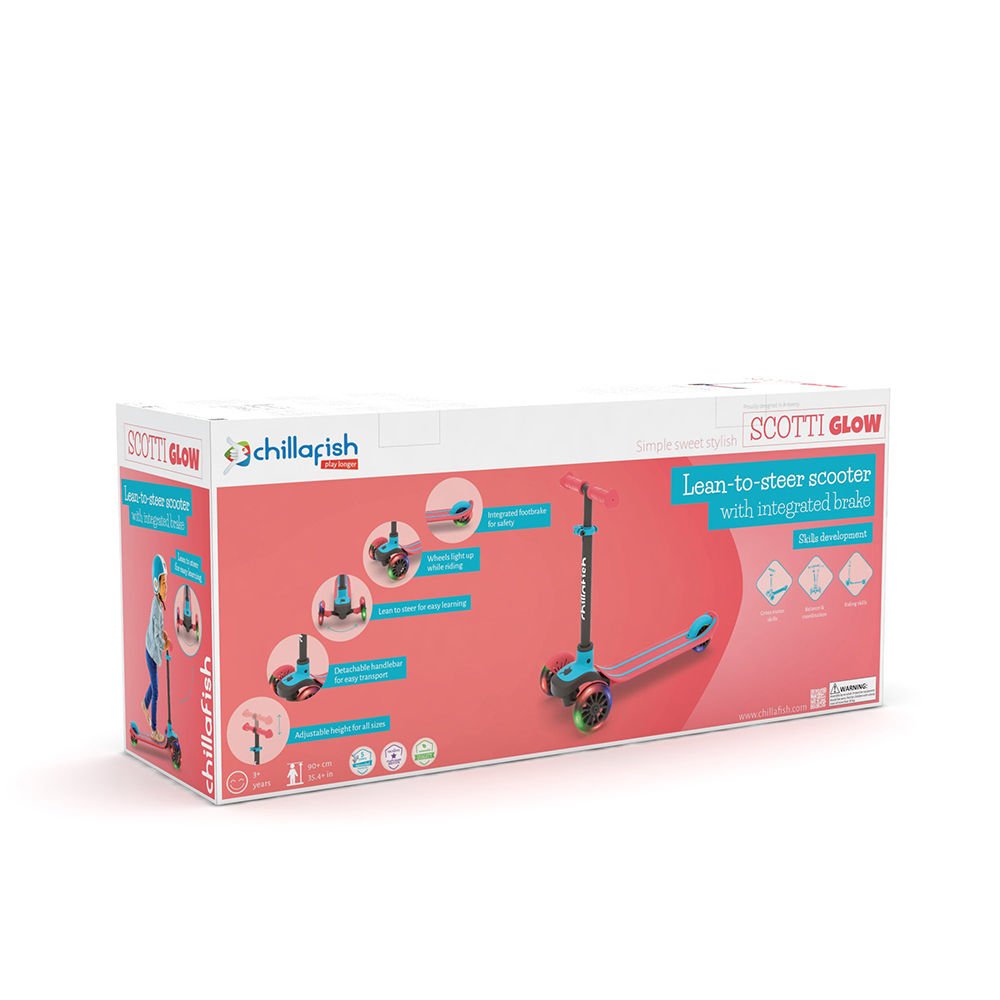 Hafif alüminyum alaşım bu scooter entegre kolay katlama sistemiyle, PU yüksek kaliteli tekerlekleriyle, güvenlik ve iyi kavrama için Chillafish imzalı Twintip güçlü plastik hafif kavisli ayak tablasıyla ve entegre ayak freniyle harika bir scooter.